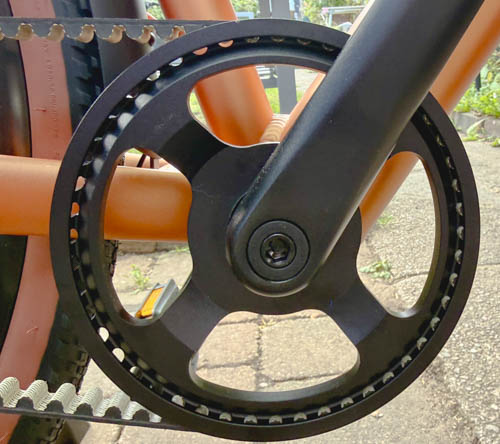 Estarli now normally fit a 42-tooth crankset at the front of the belt drive as being, in their words, “the best balance of pedalling cadence and climb ability”. I stumbled across the fact that they can however fit a larger one, with 48 teeth, either when you order the bike or apparently afterwards via a service centre.
